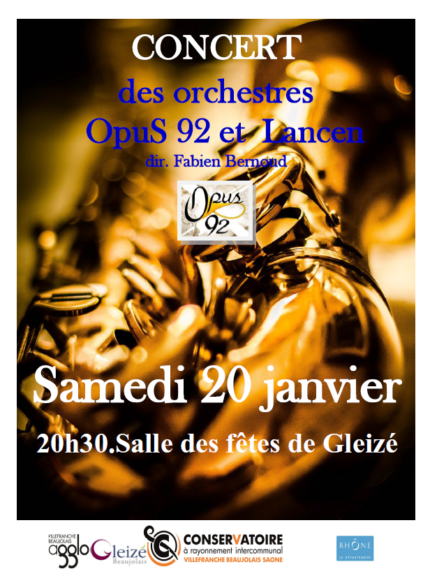 Opus 92, avec pour invité, l'orchestre Lancen, vous propose un concert le 20 Janvier 2018 à 20h30 à la salle des fêtes de Gleizé.